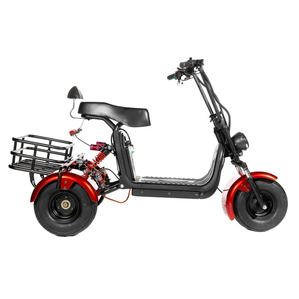 Электроскутер CityCoco GT X5 Trike с красной расцветкой облегчает езду, благодаря стабильности трех колес, а также мягкому кожаному сиденью для комфорта. Вам не нужно беспокоиться о скорости или безопасности, так как скутер оснащен дисковыми тормозами на обоих осях и прорезиненными колесами, которые повышают устойчивость и позволяют чувствовать себя уверенно на любой дороге.