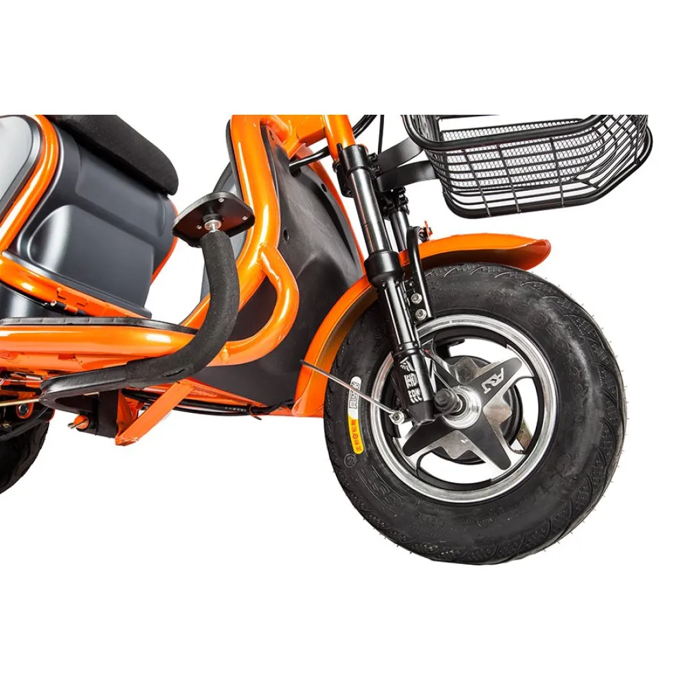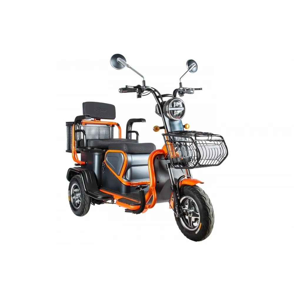 Повышенная устойчивость объясняется широкими колесами с протекторным рисунком для лучшего прохождения тс по неровной дороге. Модель обработана специальным сверхпрочным покрытием, надежно защищает от повреждения металла коррозией и различных деформаций. Максимальное прохождение расстояния на одном заряде обеспечивается долговечным аккумулятором электротрицикла. Приятной неожиданностью пользователю станет наличие охранной сигнализации с фирменными брелоками для защиты от угона.