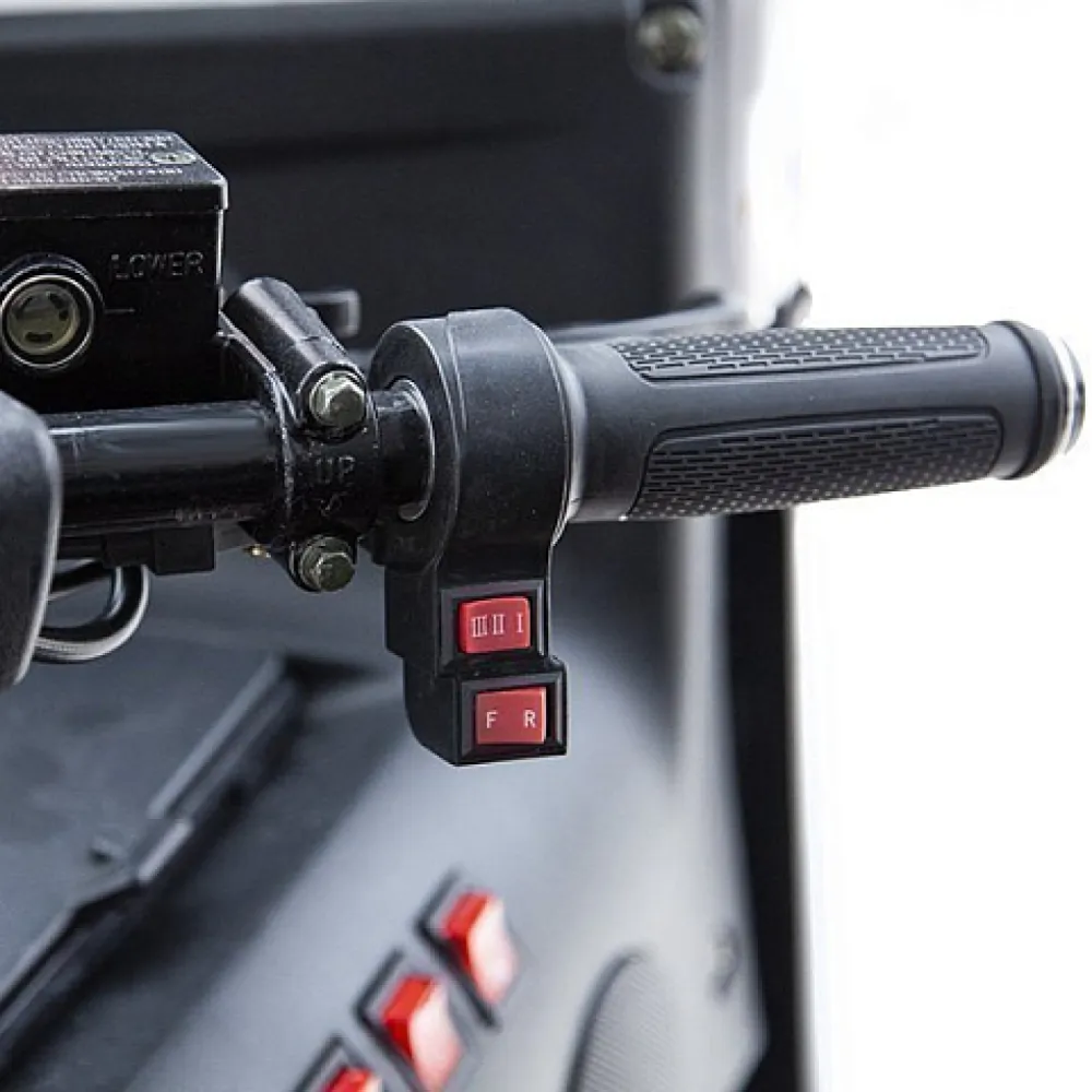 Удобство и комфорт езды обеспечены 2 мягкими анатомическими сиденьями. Наличие крыши позволяет спрятаться от негативного воздействия ультрафиолета и осадков. 12 дюймовые нактистые колеса способны преодолевать подъемы до 15 градусов, обеспечивать плавность езды по неровностям. Скорости контролируются с помощью ручки газа. Важные технические параметры с помощью бортового компьютера, размещенного на видимой части панели.