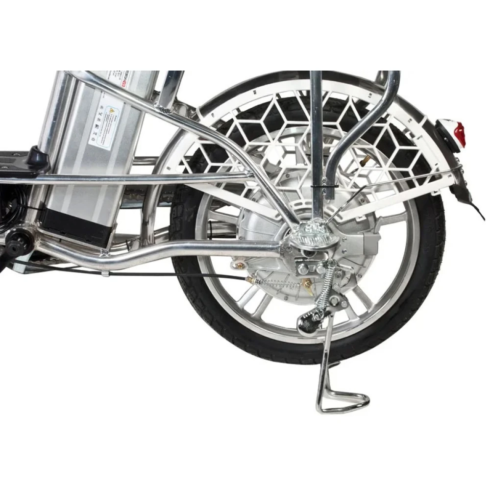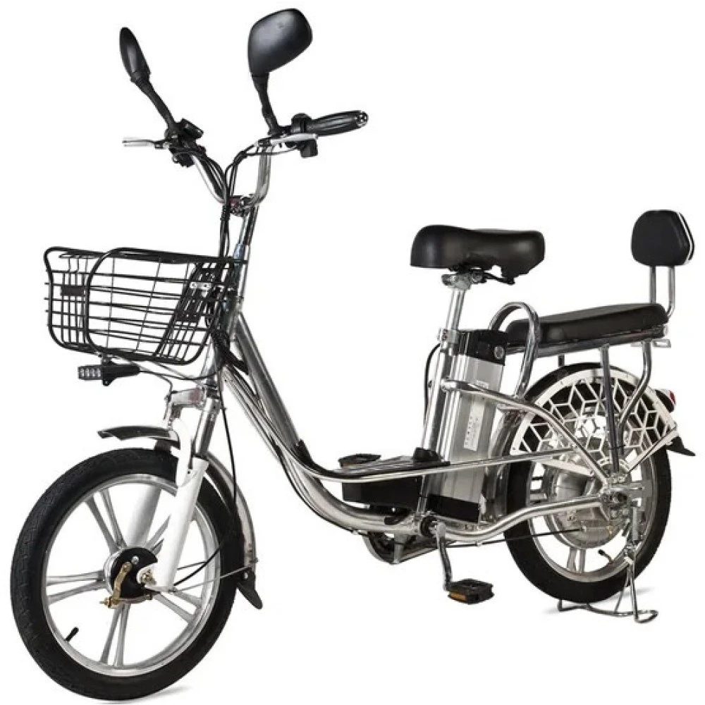 Электровелосипед оснащен большими устойчивыми колесами, мягким сиденьем для водителя и пассажира. Второе имеет удобную спинку, снижающую нагрузку с позвоночника. Техника оснащена всем необходимым для активного время провождения, поездки в магазин